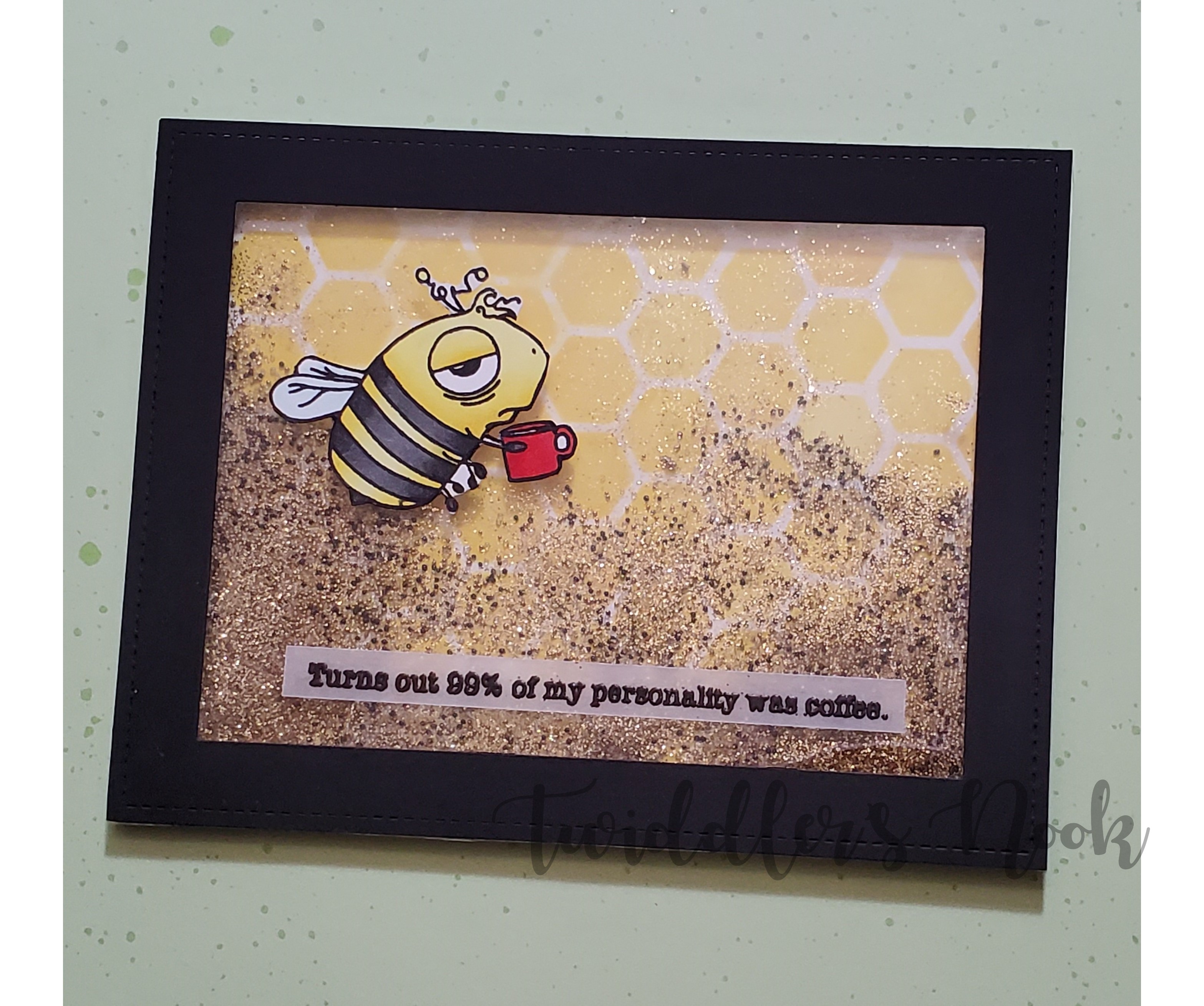Next, I began to build my shaker. Since I don’t have frame dies, I took two nested rectangles and just cut the smaller one out of the bigger one leaving me with a perfect frame! I attached the frame to a sheet of acetate and then used my anti-static powder bag on the inside and the distressed background. I added foam tape around the edge and filled it with some shaker bits that I had in clear, gold and black. Then I layered the backing onto the frame, sealing the shaker. Next, I added my bee and sentiment to the front and attached the entire thing to a card base. Voila! Honey-infused, caffeinated fun to mail to a friend!