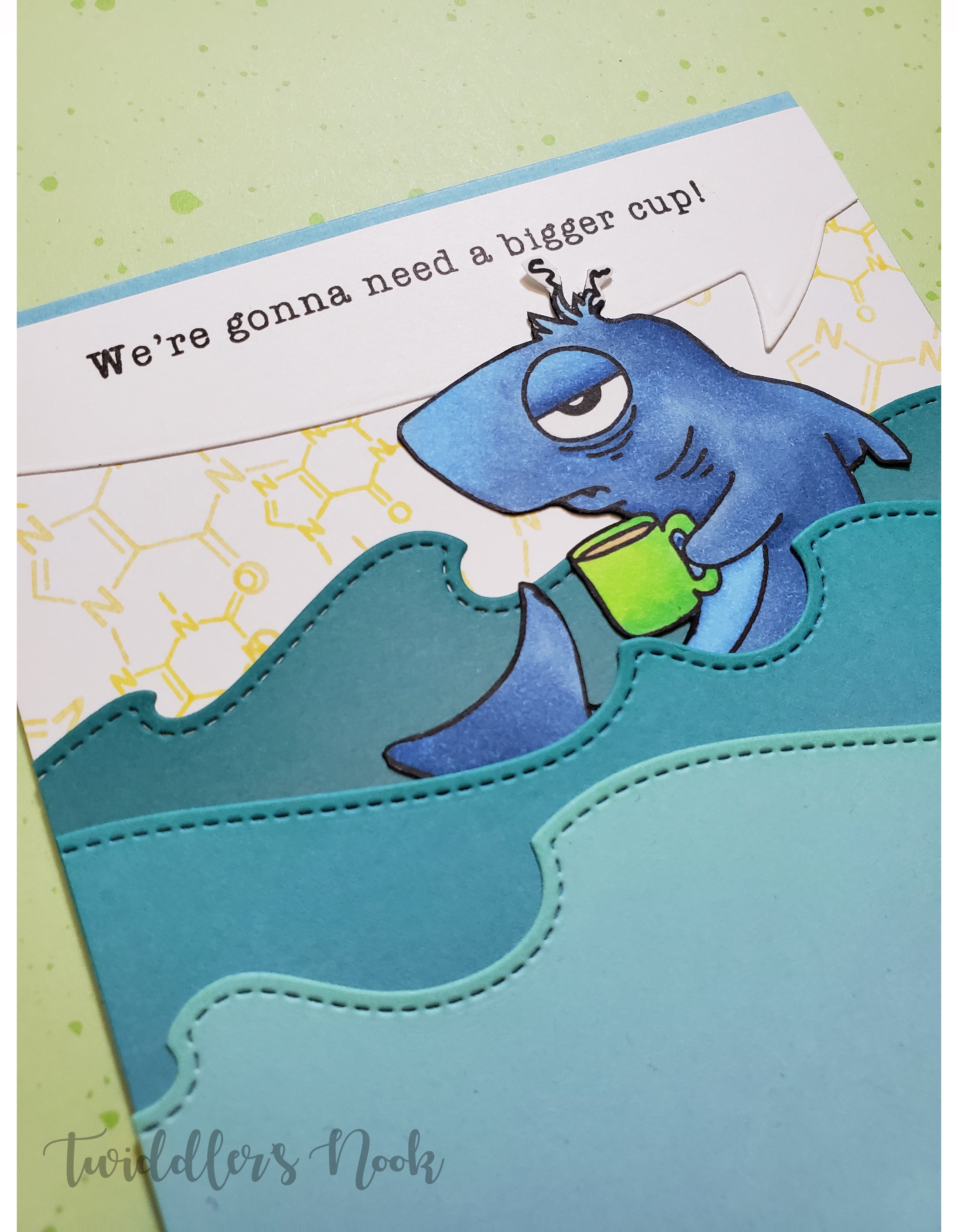 I stamped and colored my sleep deprived shark with copic markers using the following colors: C1 is a base for the entire shark, B32, B34, B37, YG05, YG07 and YG09. I fussy cut him out as well and then began die cutting some waves using the Lawn Fawn stitched wave borders. I also used the speech bubble die from Lawn fawn and stamped the sentiment on that. Then I layered it all together, hiding my shark in the waves like he’s just bobbing there waiting for a refill.