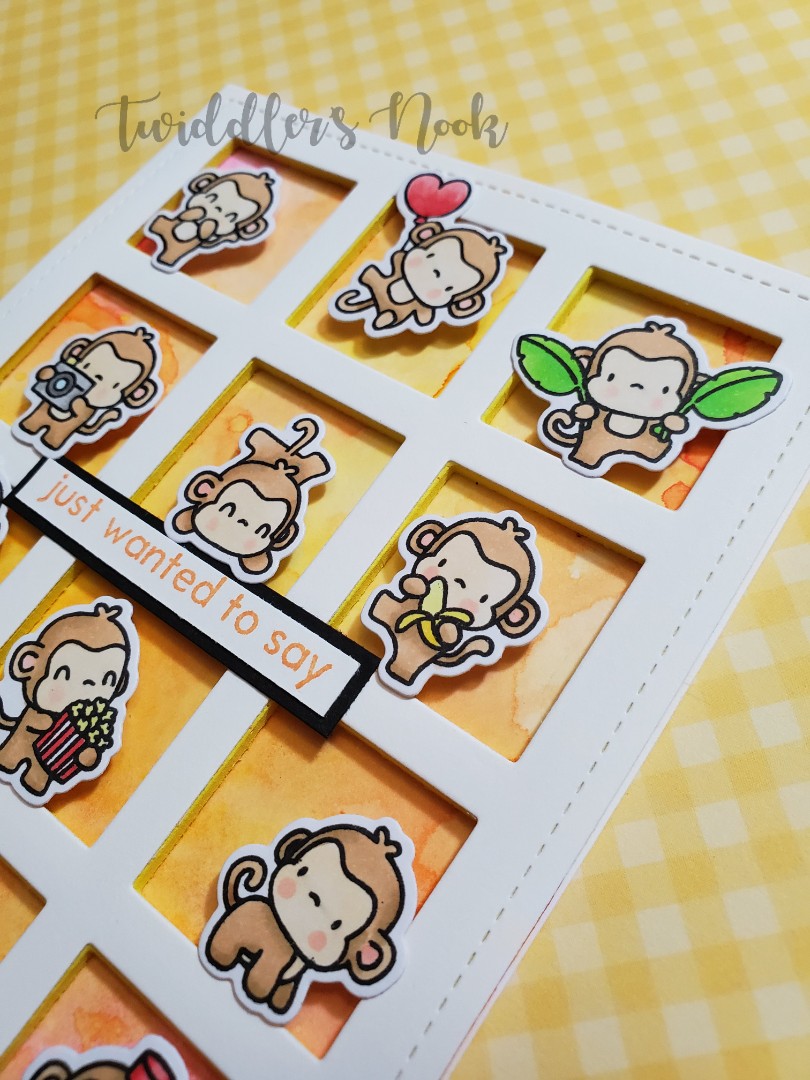 Then, I die cut the Mama Elephant Grid Window from white cardstock and also craft foam and layered them together. Then glued it to the card base and started laying out my monkeys. I attached the monkeys with foam squares for added dimension and then stamped a sentiment from the Avery Elle Peek-a-Boo Pals stamp set on white cardstock and layered it on a slightly bigger piece of black cardstock to help it pop.