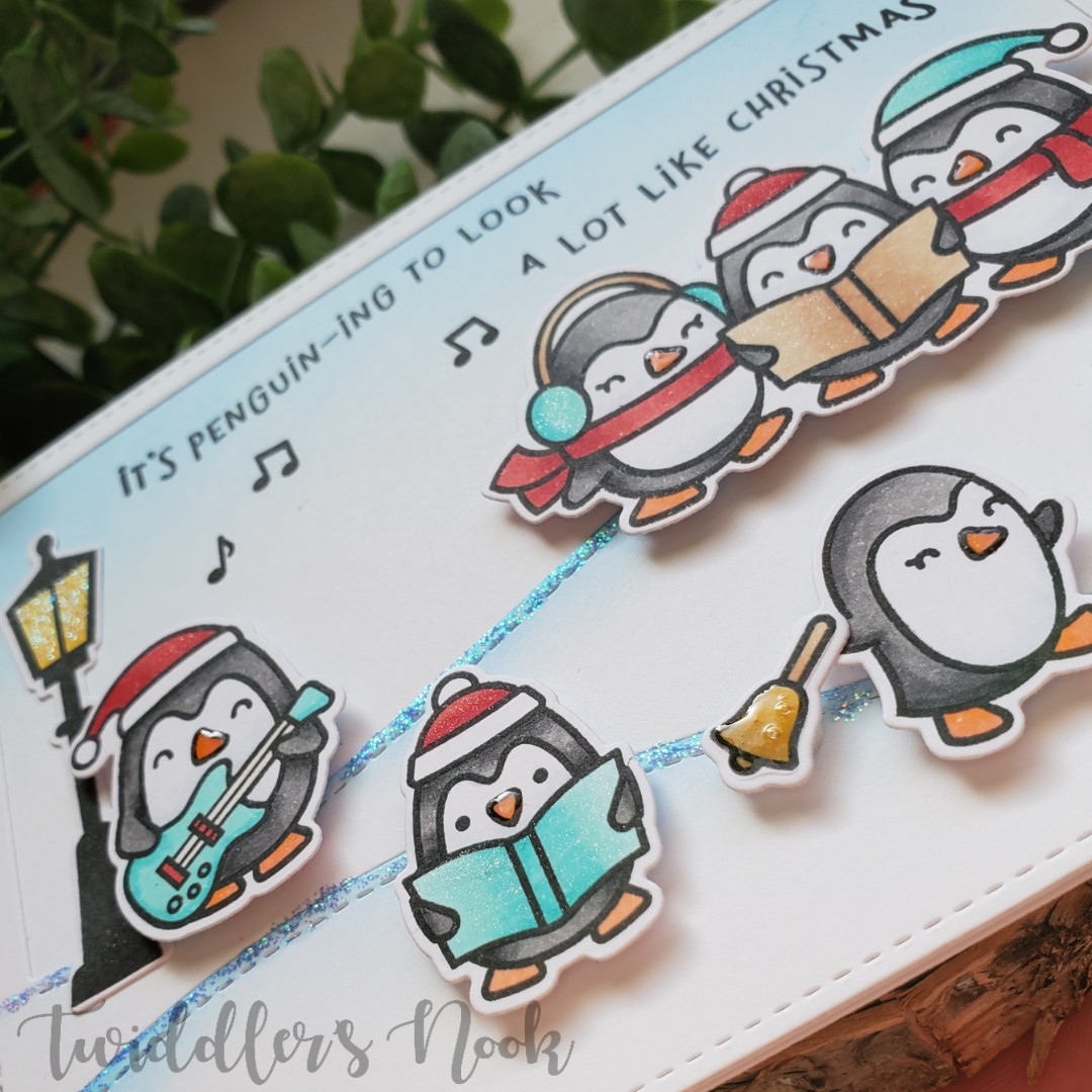 - For finishing touches I added glossy accents to all the penguin beaks and bells, Stickles to the hillsides and light, and then Wink of Stella glitter brush to the hats, earmuffs and music books.