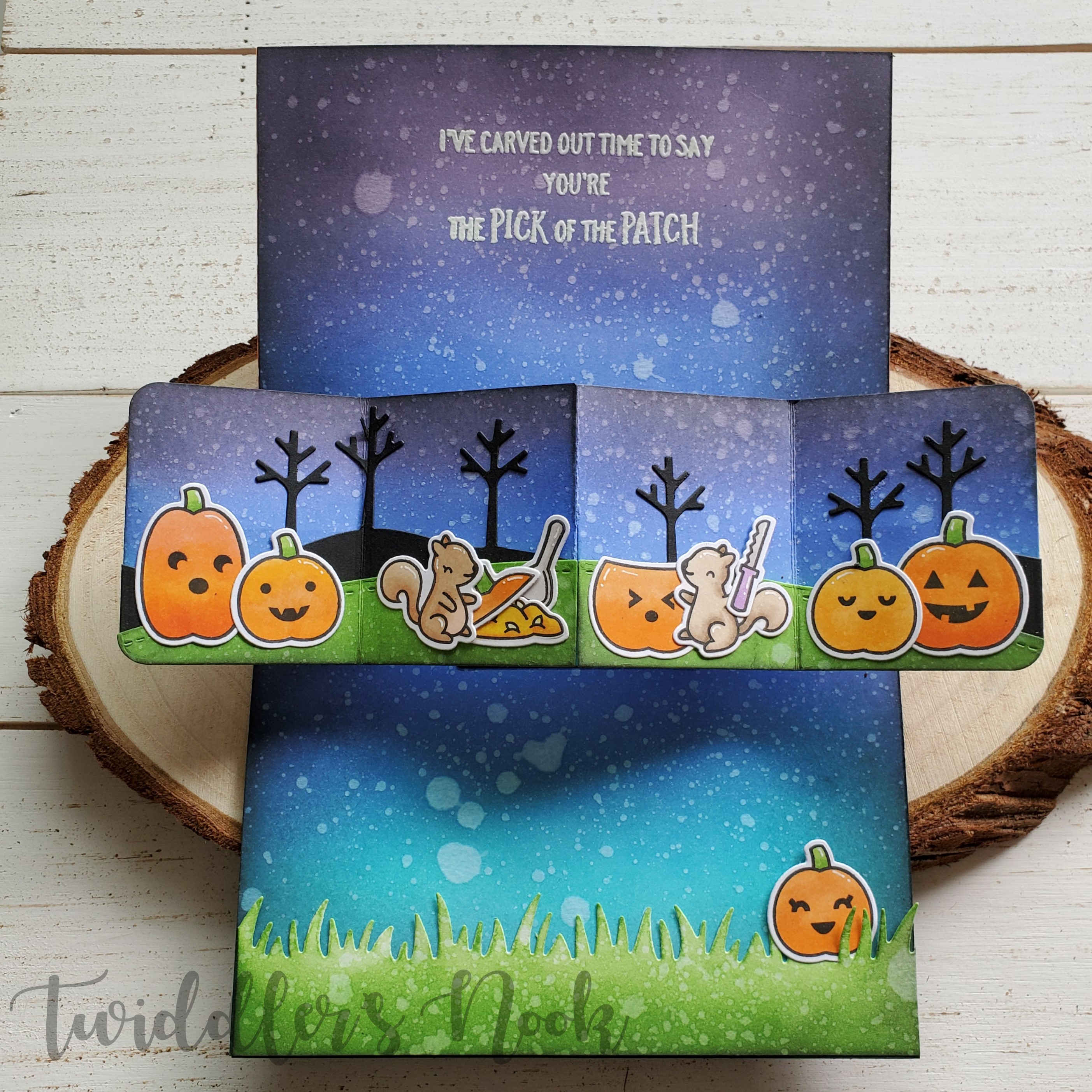 Here’s the front. I used fabulous Lawn Fawn striped paper for the background, ink blended and water spritzed a night sky. Then popped up the Lawn Fawn spooky fence with foam tape. I glued the pumpkins and squirrels from Pick of the Patch directly down and heat embossed my sentiment. Isn’t this card front so sweet? But wait! There’s more!!!