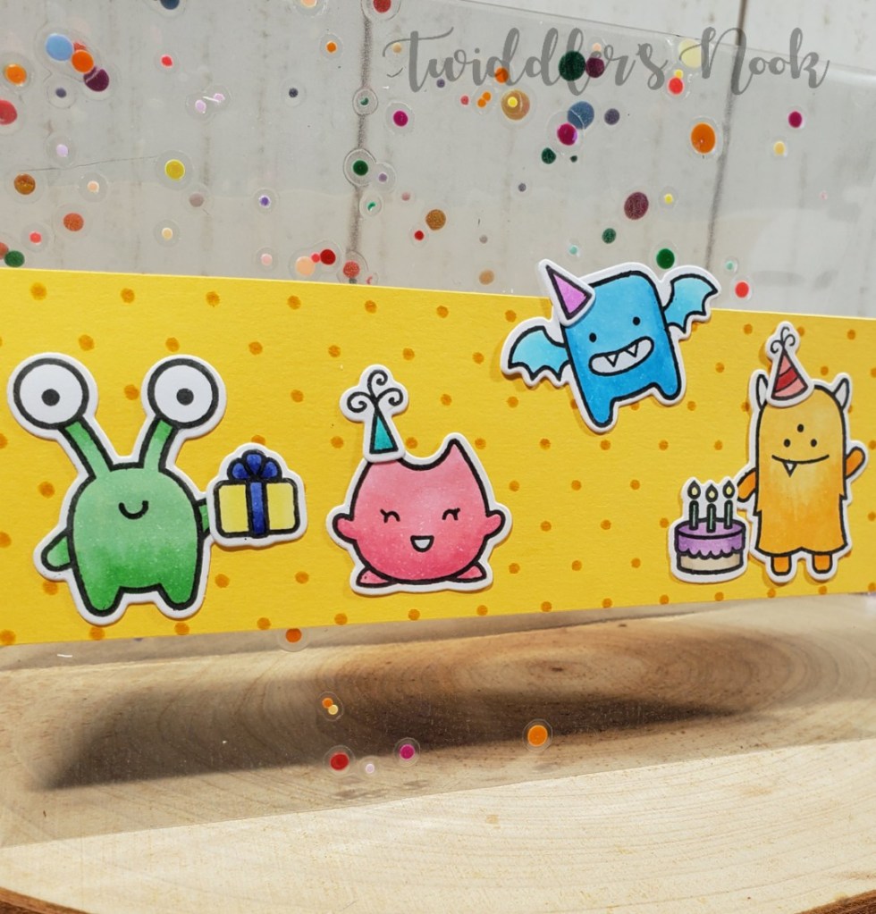 - For the stamping, coloring portion…we cut a yellow strip to 1.75×5.5 and stamped a polka dot background stamp in yellow for a tone-on-tone look.