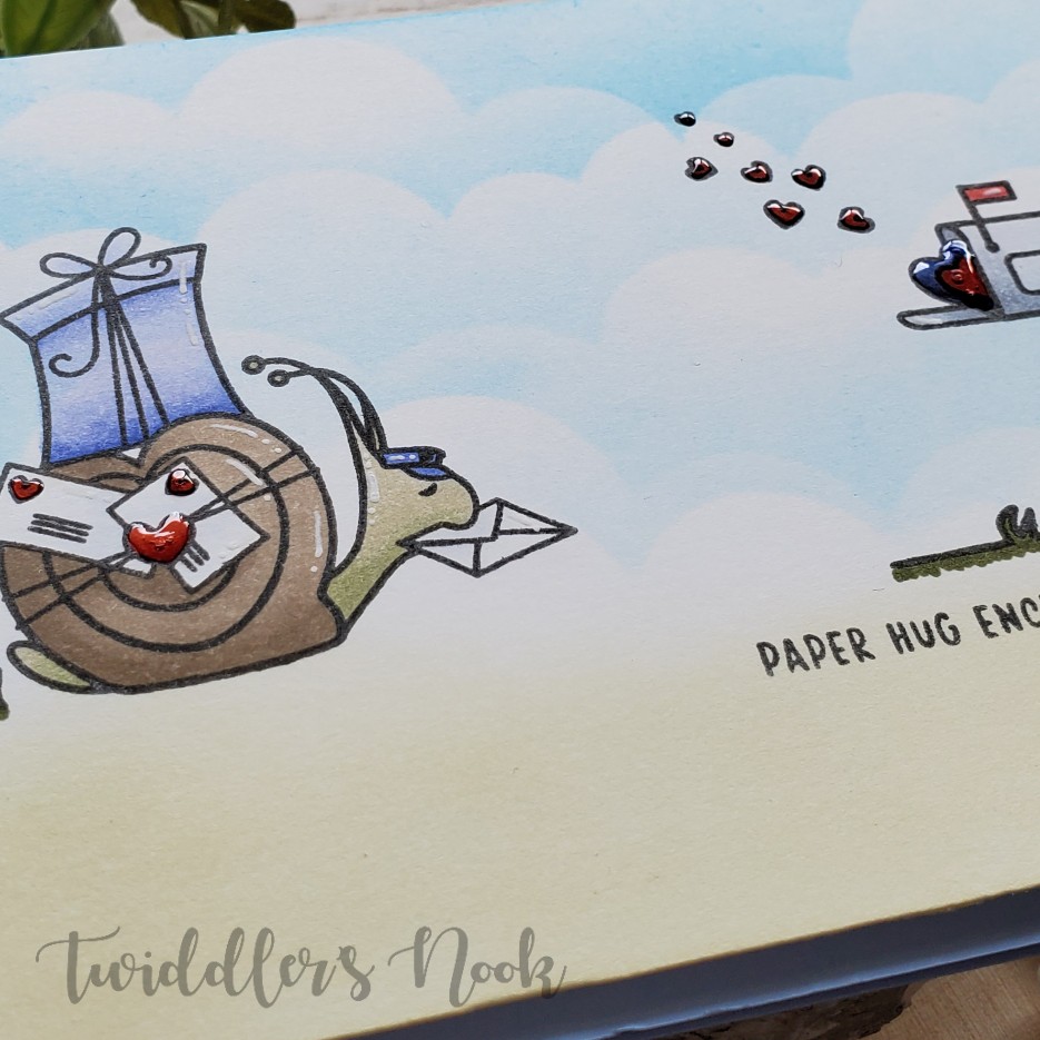 I stamped my snail and mailbox and colored them with copics. Then I stared at my panel for a very long time. It didn’t help. So, I slept on it and when I woke up in the morning, it hit me…stencils! So I got up and stenciled some cute clouds and gave it a ground and voila! I love it! For finishing touches I added glossy accents to all of the hearts and white gel pen accents throughout the images. After all that I popped the panel on a piece of craft foam for dimension and then to a blue card base and it’s ready to go.