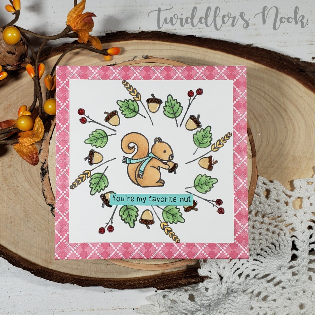 Hello again! Today I’m excited to share this super cute mini card using the Trinity Stamps nutty squirrel set. I’ve been having so much fun with this set since I got it. The squirrel is such a great focal image and all the foliage images that also come in the set immediately had my wheels turning for a wreath builder card. So, that’s what I’m sharing with you today.