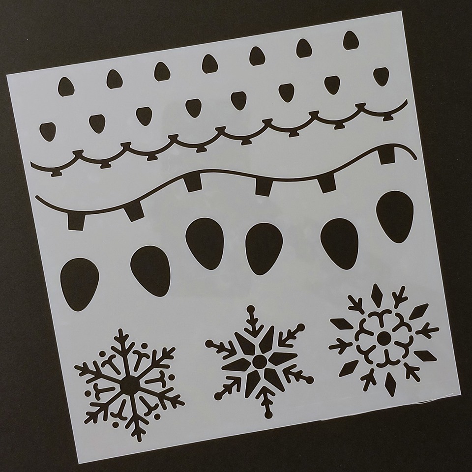 Once my card base was created, I stenciled snowflakes from the new Light Me Up stencil all over the background. I stamped, colored, cut out and popped up my mouse in the middle and heat embossed my sentiment. Then added a second heat embossed sentiment strip below that.
