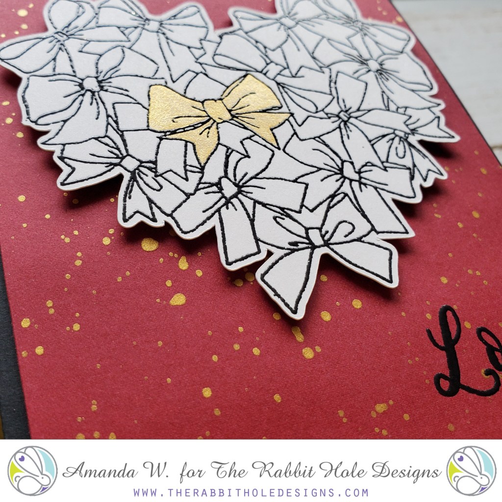 I heat embossed my bows in black and painted one that stood out to me with gold watercolor. I took the same watercolor and flicked it on a red panel. Then heat embossed love in black on the bottom right corner. I popped the red panel on a black card base and popped the bows up with foam squares.