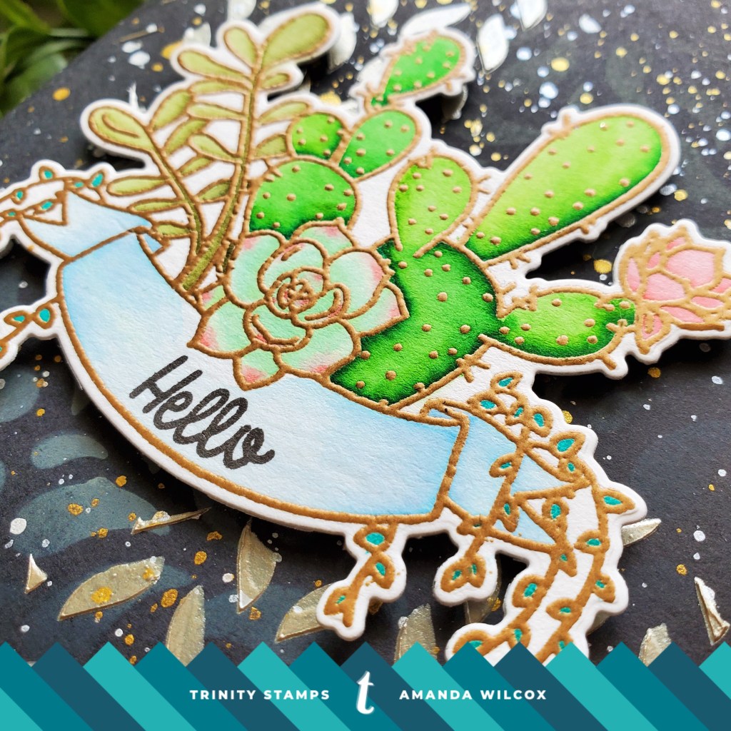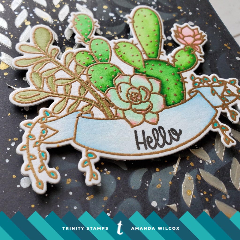 Hello everyone! I hope your weekend is going well. I’m stopping in today to share a different style card than I typically play around with. The stamp set I chose was a Christmas gift that I was so excited to play with. It’s called Succulent Banner from Trinity Stamps. It’s in the Last Chance section now so you’ll want to stop by and grab one before they’re gone. There are quite a few fabulous sets at great prices so…treat yourself! 🙂