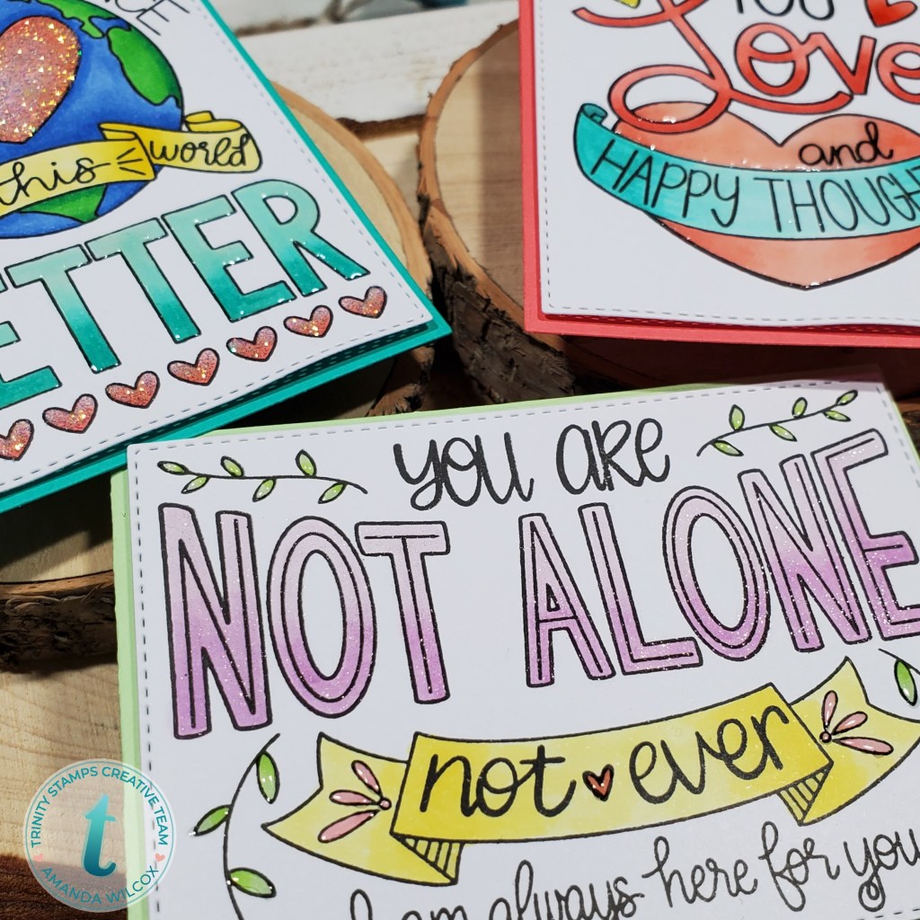 Hi everyone! I’m over on the Trinity Stamps blog today sharing this set of mini encouragement cards featuring the new word art stamps – Not Alone, Love & Happy Thoughts and A Better Place. I paired them with the new Slimline Series: Frame & Fold dies to make some quick, easy and gorgeous mini cards to share with anyone in your life needing a little pick-me-up!