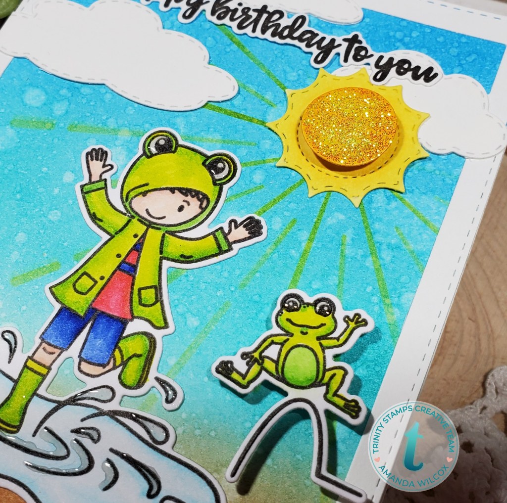 Now for assembly – I adhered my inked panel to a card base and then the frame to that. Next, I glued the clouds to the coordinating spots on the frame and trimmed away the excess. I used liquid glue to adhere my sun. (I find this holds better to the inked panels.) And then a foam dot to put the center on the sun. I adhered my kiddo directly to the card front and popped the frogs up like they are jumping right out of the card.
