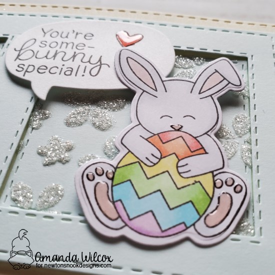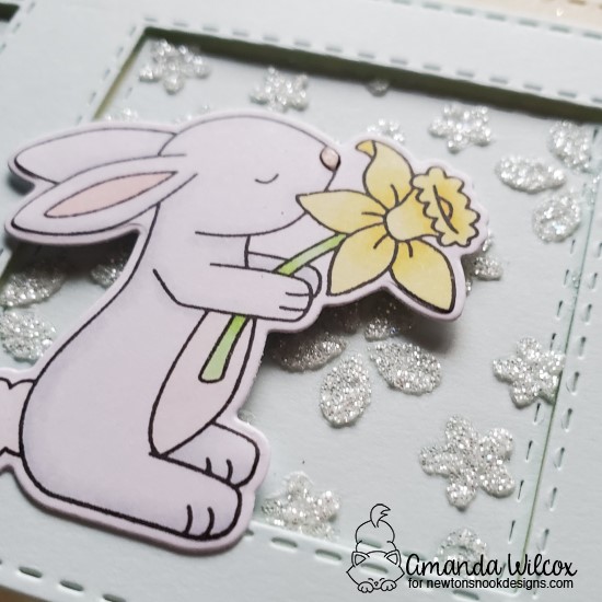 Beautiful card. I love the glittering background flowers and the 3 windows with a bunny on each one. Thank you.