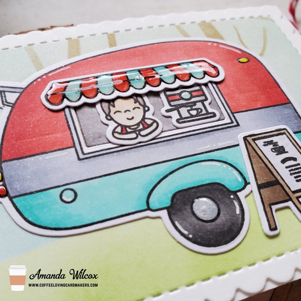 For finishing touches on this card, I added white gel pen accents throughout and then a couple of touches of glossy accents on things like the awning to the trailer and the lid to the guy’s frapp!