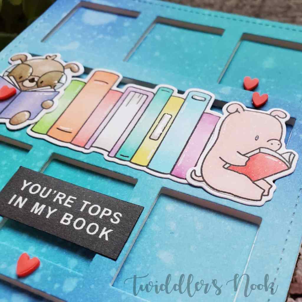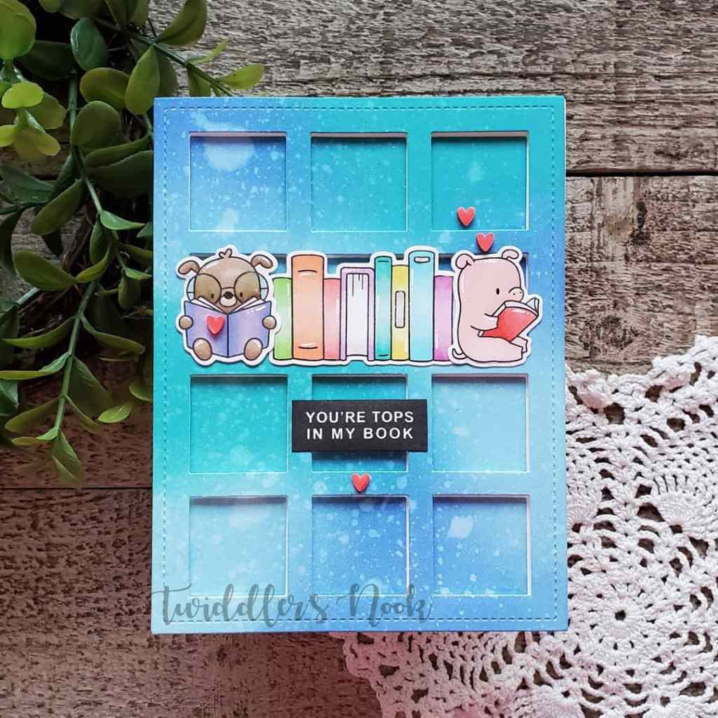 I started this process by laying my stamps over my grid window die cut to see if things would fit how I wanted. When it did, I stamped my images from Book Worm, colored them and cut them out with the coordinating dies.