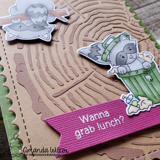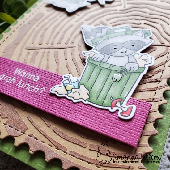 For today’s card I started by getting messy…again. 😉 I added paint to my texture paste and used it over my Tree Rings stencil on kraft cardstock. I set that aside to dry while I stamped and colored my images from Raccoon Rascals using copic markers. Then, I die cut them using the coordinating dies.