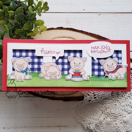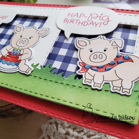 Now for the actual assembly, I adhered the red panel to a card base, then the blue patterned paper to that. I popped up the white frame with foam squares and adhered the grass to that. The piggies are attached with a combo of tape runner and foam squares where they overlap the window openings.