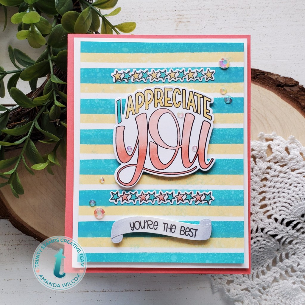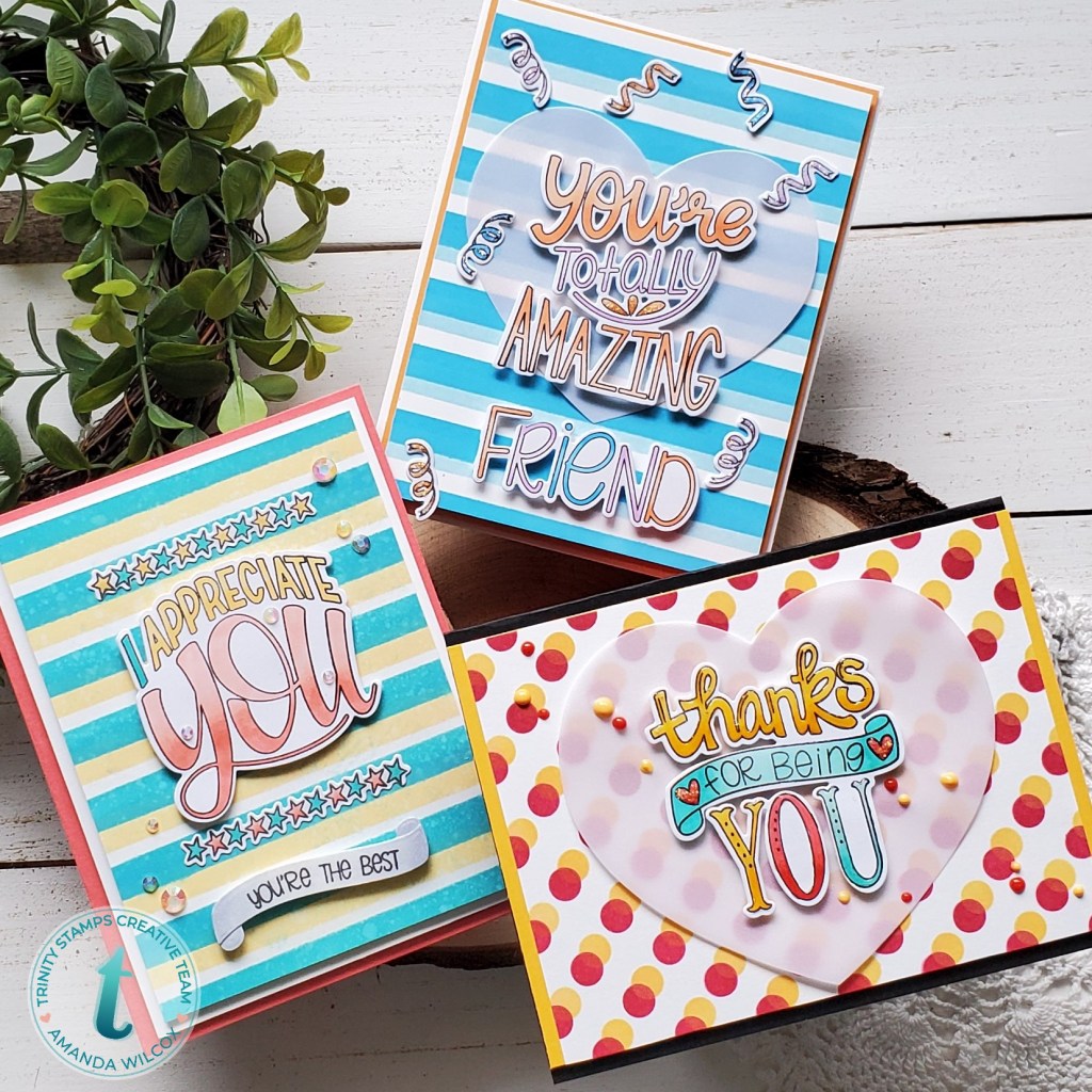 Hey everyone! I’m up on the Trinity Stamps blog today sharing this great trio of appreciation cards with the recent new release. I love these amazing word art style stamps that Love Dani Studio designs for Trinity! They are so much fun and for the sentiment to #1 fill the card front and #2 be an amazing decorative focal point is just awesome!