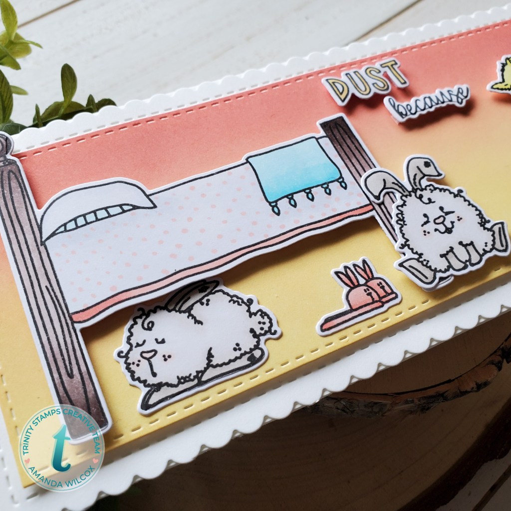 I had already used my Dust Bunnies stamps as a guide to decide on a design so now I just had to stamp, color and cut them out with the coordinating dies. I popped everything up with foam tape except for the images under the bed. I love how having them set back makes it look like they’re really under there. So cute!