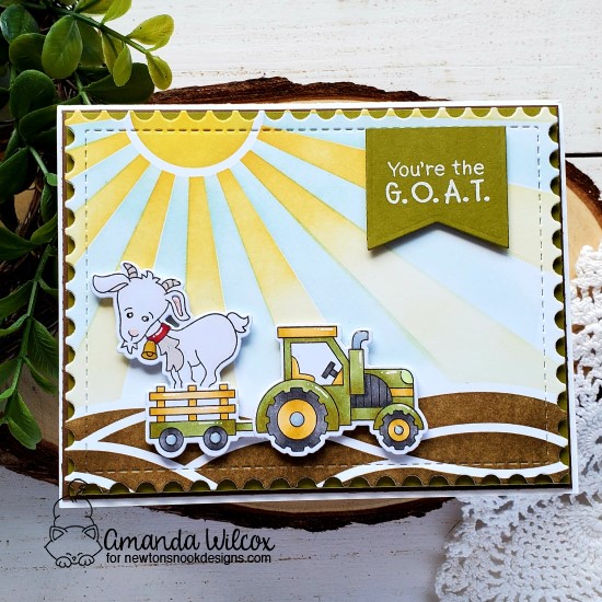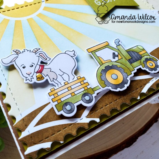 To create my card, I stamped, colored and die cut my images from Bleat and Farming Fun and set them aside. I pulled out the Framework dies and Sunscape stencil again and inked it up. This time after I inked the dirt and yellow part of the sun, I rotated the stencil and used it like a mask to add a little blue sky too.