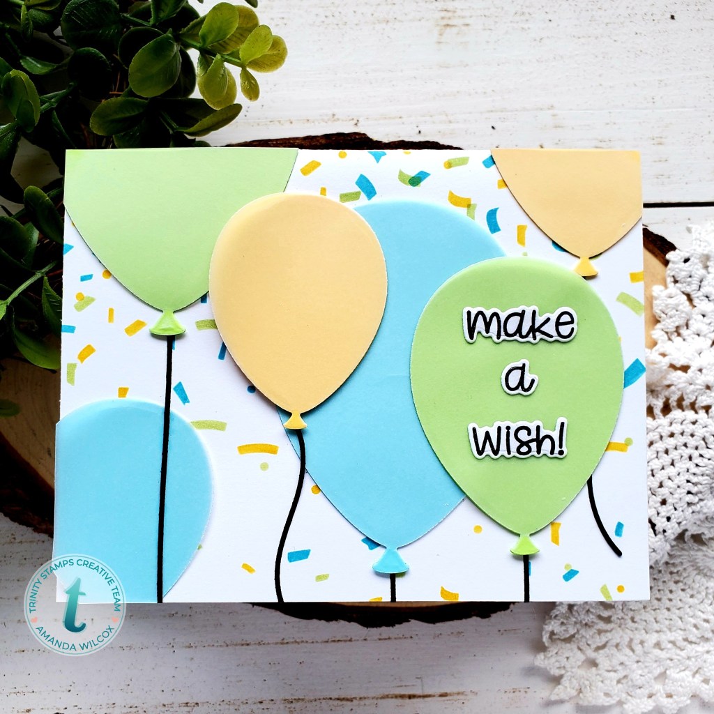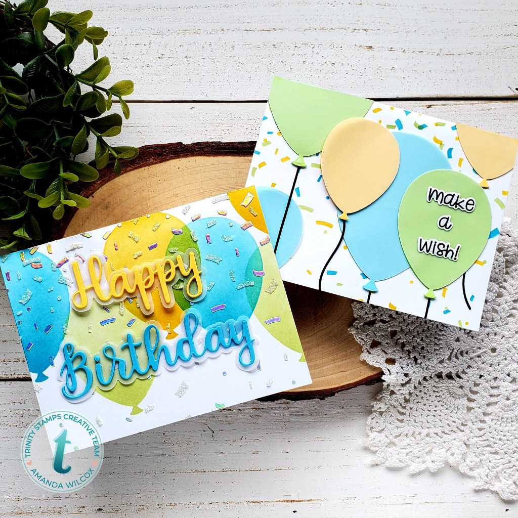I have a couple of really fun cards to share with you sneak peeking a few more products that will be available from Trinity Stamps in just a few days. It’s Trinity Stamps’ birthday so there are some fun birthday themed products and I couldn’t resist making a couple of birthday cards. I chose a color scheme, started playing and ended up with more than one fun card for today.