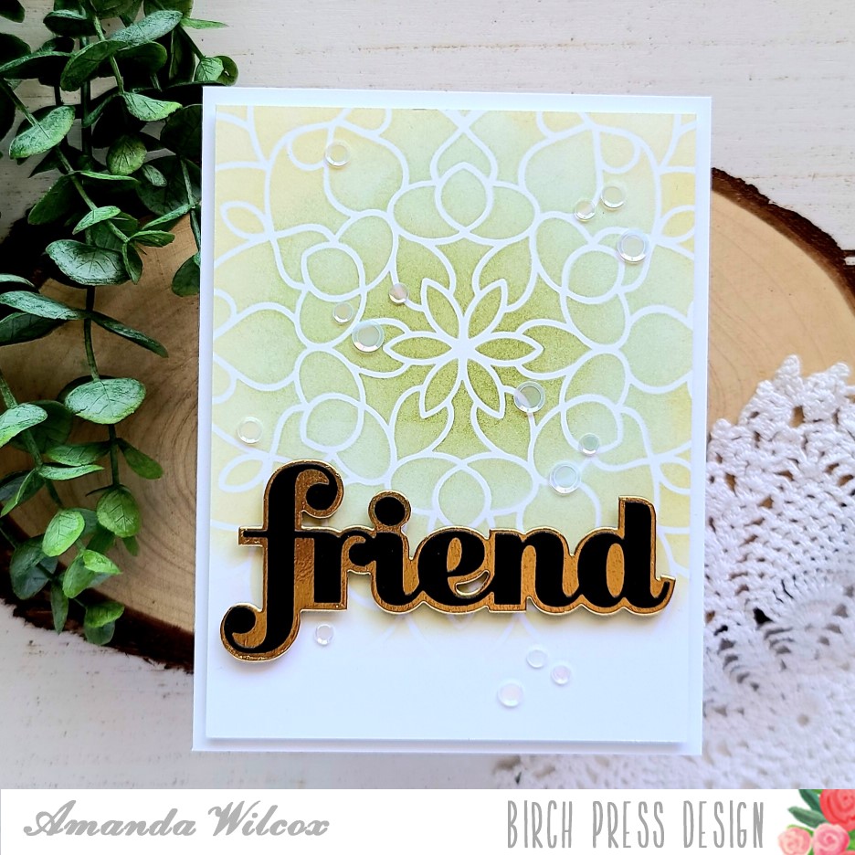 For this design, I brought the stencil down much further and stuck with some natural green and muted yellow inks. I absolutely love how this turned out! I also brought a little shine to this sentiment with gold mirror cardstock and pearl confetti bits scattered all about. This one may be my favorite.