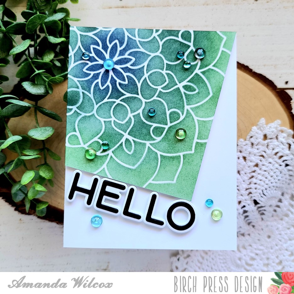 Something struck me when I moved on to this final card and I decided to try stenciling at an angle instead of centered. I think it turned out really cool and would definitely try this design again. I finished it off with a simple hello and some great clear blue and green bubbles from my stash.