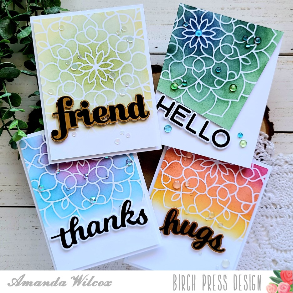 Hello everyone! I hope you’re having a great week so far. Today I’m over on the Birch Press Design blog featuring this set of 4 stenciled cards. They are quick and easy to pull together if you need something in a jif or if you’d like to mass produce cards to have in your stash. They would make a great gift to give as well.