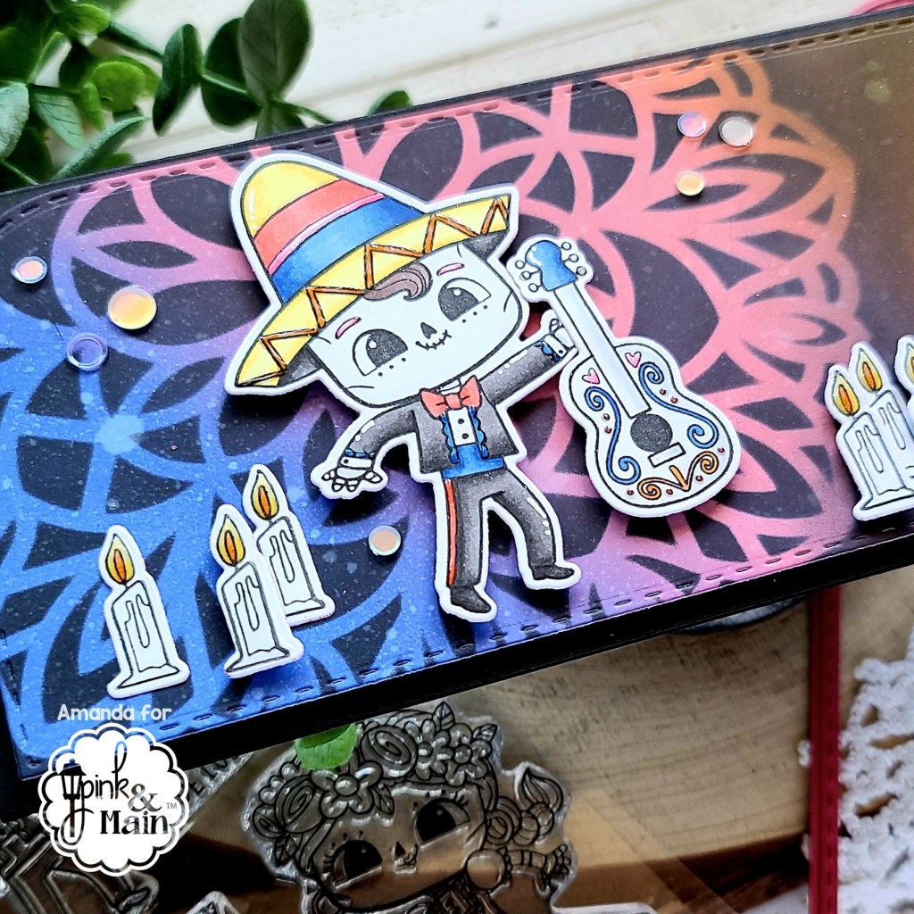 Next, I stamped and colored my images from Day of the Dead with my copics and then used the coordinating dies to cut them all out. I arranged them on my panel how I wanted and then adhered them with a combination of liquid glue and foam squares.