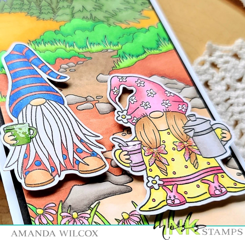 When I think of gnomes, I think of them living in the woods, enjoying nature. So I thought it would be fun to combine Coffee Gnomes with Beautiful Destination for my scene. I stamped and colored my gnomes with copics and used the scan-n-cut to cut them out. Then I cut a panel to 3×8 and stamped Beautiful Destination on it and colored the scene with my copics as well. Once the coloring was done, I stamped my sentiment on one of the mountains before mounting everything. Then, I popped the panel up with foam tape on a black panel that measures 8.25 x 3.25. And then popped that up on a white slimline card base.