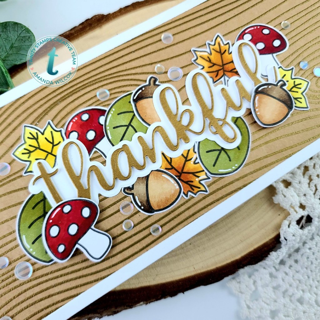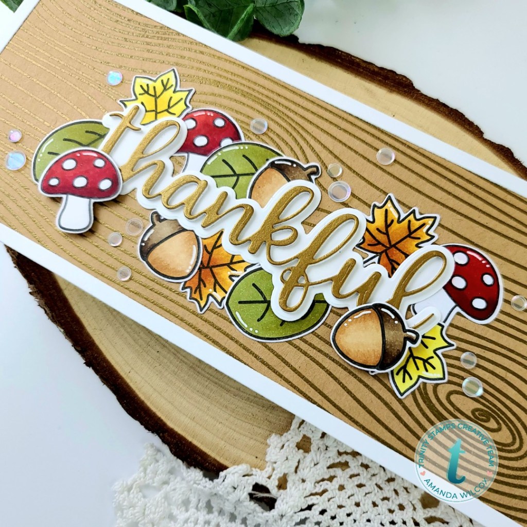 To create today’s card, I started with the Trinity Stamps woodsy background stamp by heat embossing it on kraft cardstock with gold embossing powder. Then I stamped the images from the same stamp set and colored them with my copics. I used the coordinating dies to cut them out and set them aside.