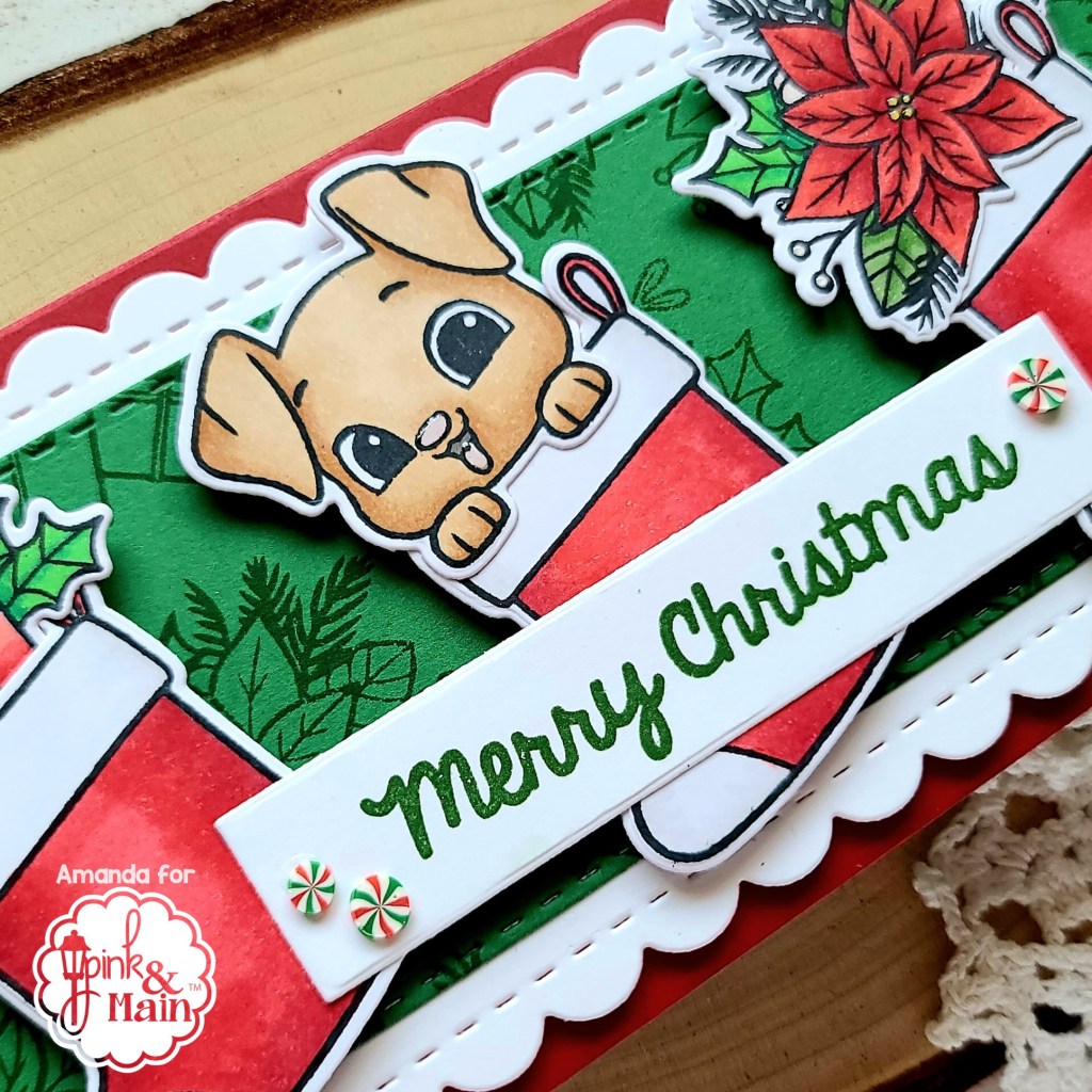 For those, I added glossy accents to the puppy’s nose and tongue, all the mistletoe berries and poinsettia center. Last, I glued a couple of wintermint candy embellishments from my shop to the sentiment strip.