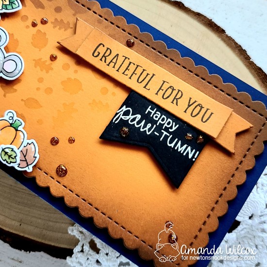 For finishing touches, I went with white gel pen accents on the images and a little bit of glossy accents on the acorn hats, pumpkin stems and Newton’s Nose. Then I scattered some Nuvo Glitter Drops in golden sunset across the design.