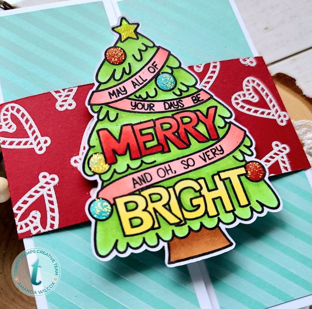 Today I’m showcasing a new stamp set called Merry and Bright. I just love how happy this big tree is! I thought it would be fun to make a gatefold card and have my tree on the belly band holding it all shut. I used one of the candy cane images from the set and heat embossed it on the belly band before popping the tree up with foam squares.