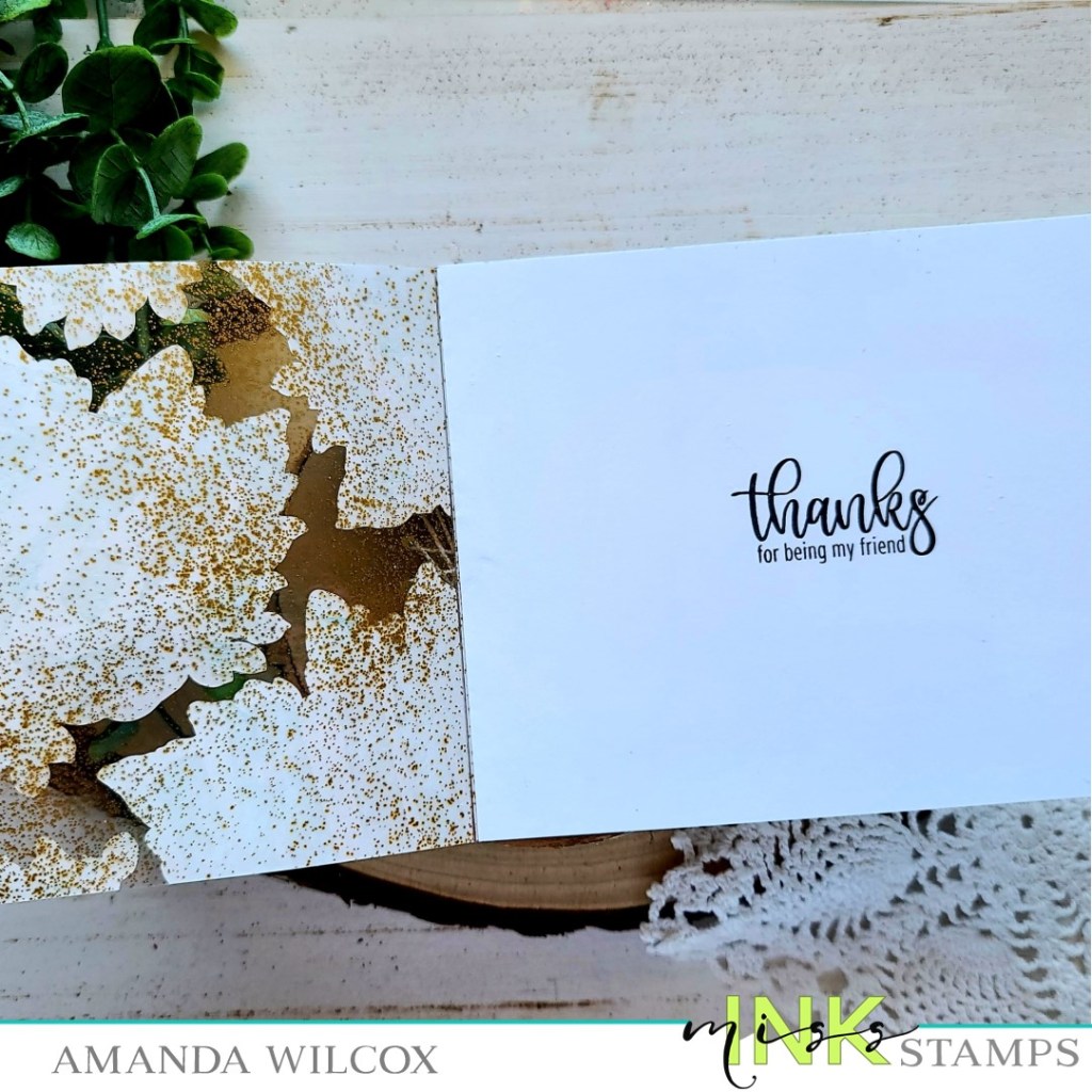 Using the images on the front to position my sentiment, I stamped it on the inside where it’s hidden from view. I also love how the gold embossing powder shows through on the inside and hides the adhesive holding the images in place on the front too.