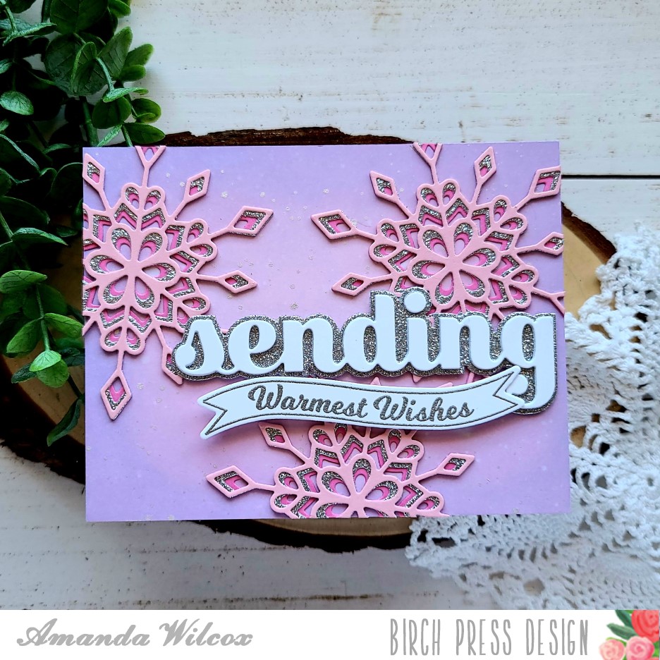 I had a lot of fun creating this card. I started with what ended up as my ornament just playing around, then switched out the middle layer for some silver cardstock and kept going. I blended spun sugar and shaded lilac distress oxides for my background and also added a splatter of water and pearl watercolor for some shimmer. I adhered my snowflakes, cut off the excess and adhered my panel to a card base.