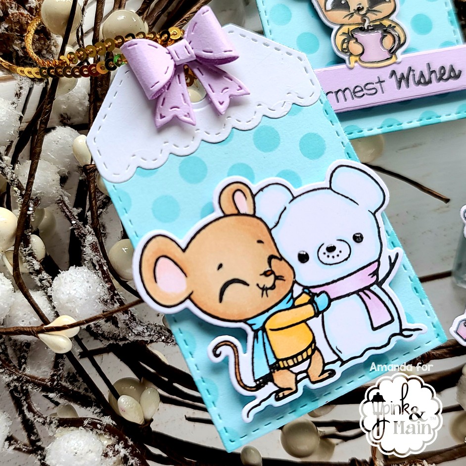 Taking a look at each tag individually, I thought it would be fun to add the banner from the die set with a little sentiment for this sweet mouse holding his hot cocoa. I also added glossy accents to his nose and mug for a little shine.