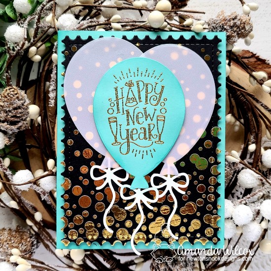 I started this card by using Thermoweb Transfer Gel on a piece of black cardstock using the Bubbly stencil. Once it was dry, I sent it through my laminator with gold decofoil for a fun, festive look of champagne bubbly in the background. Then I die cut the solid balloon from the Balloon Shaker Die set 3 times – two from vellum and one from teal cardstock. I stamps the new Happy New Year image in VersaMark and heat embossed it in gold on the teal balloon. Then I die cut the strings from white cardstock and glued them to the bottom of the balloons.