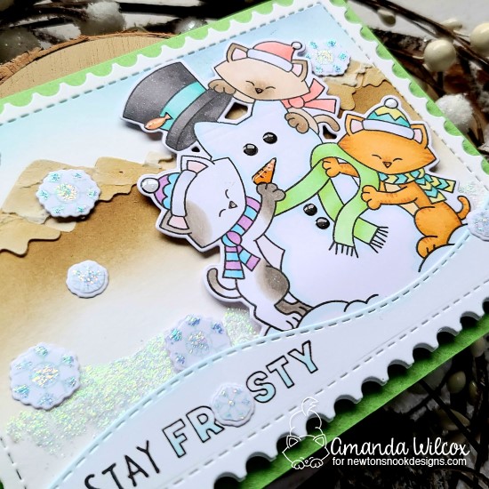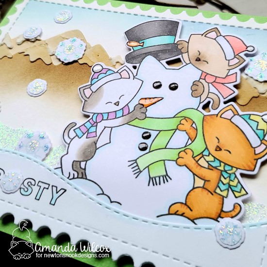 I glued my Newton’s Snowman image to the back of the snowdrift and popped that whole piece up with foam squares. I colored the word FROSTY with light blue copics so it glows just a bit. I added a little unicorn Stickles behind the image and snow drift for the look of another layer of snow glistening in the sunshine. Finally I used liquid glue to add the snowflakes and replaced the “O” in FROSTY with one too.