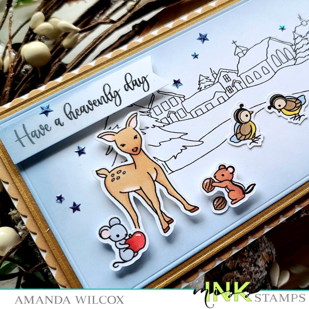 I started by stamping and coloring the images from Little Angel. Then I used the scan-n-cut to cut them all out. Next, I stamped the snowy village image on a piece of white cardstock and used a slimline rectangle to cut it out. Then I went around the edges with stormy sky distress oxide ink.