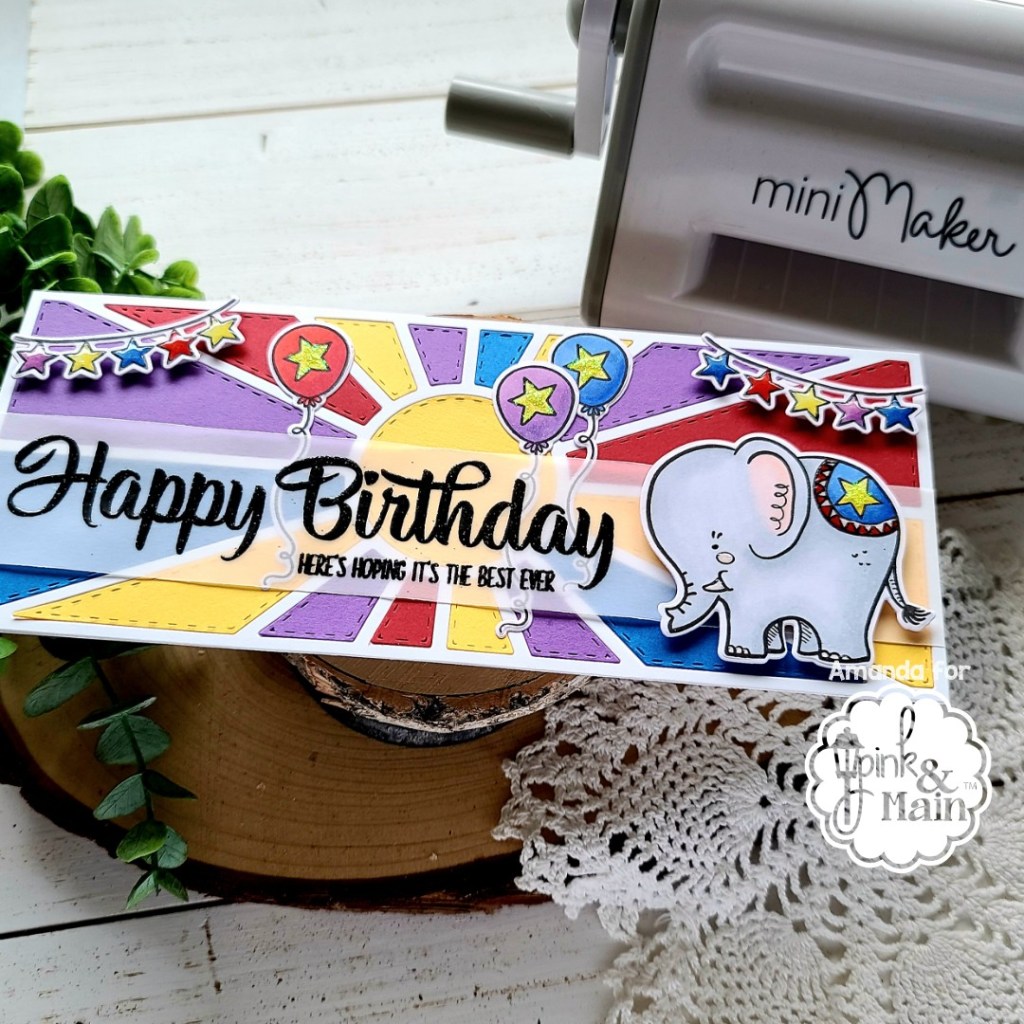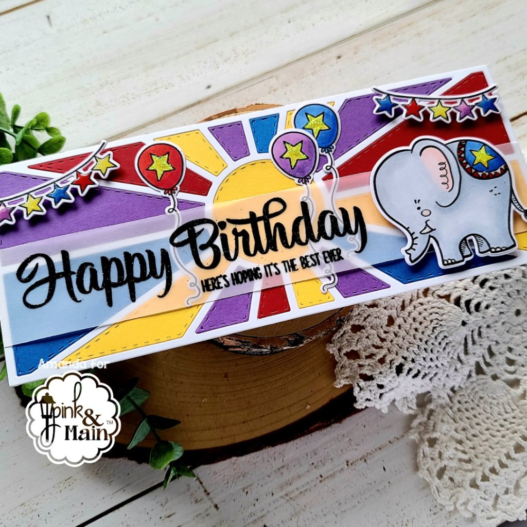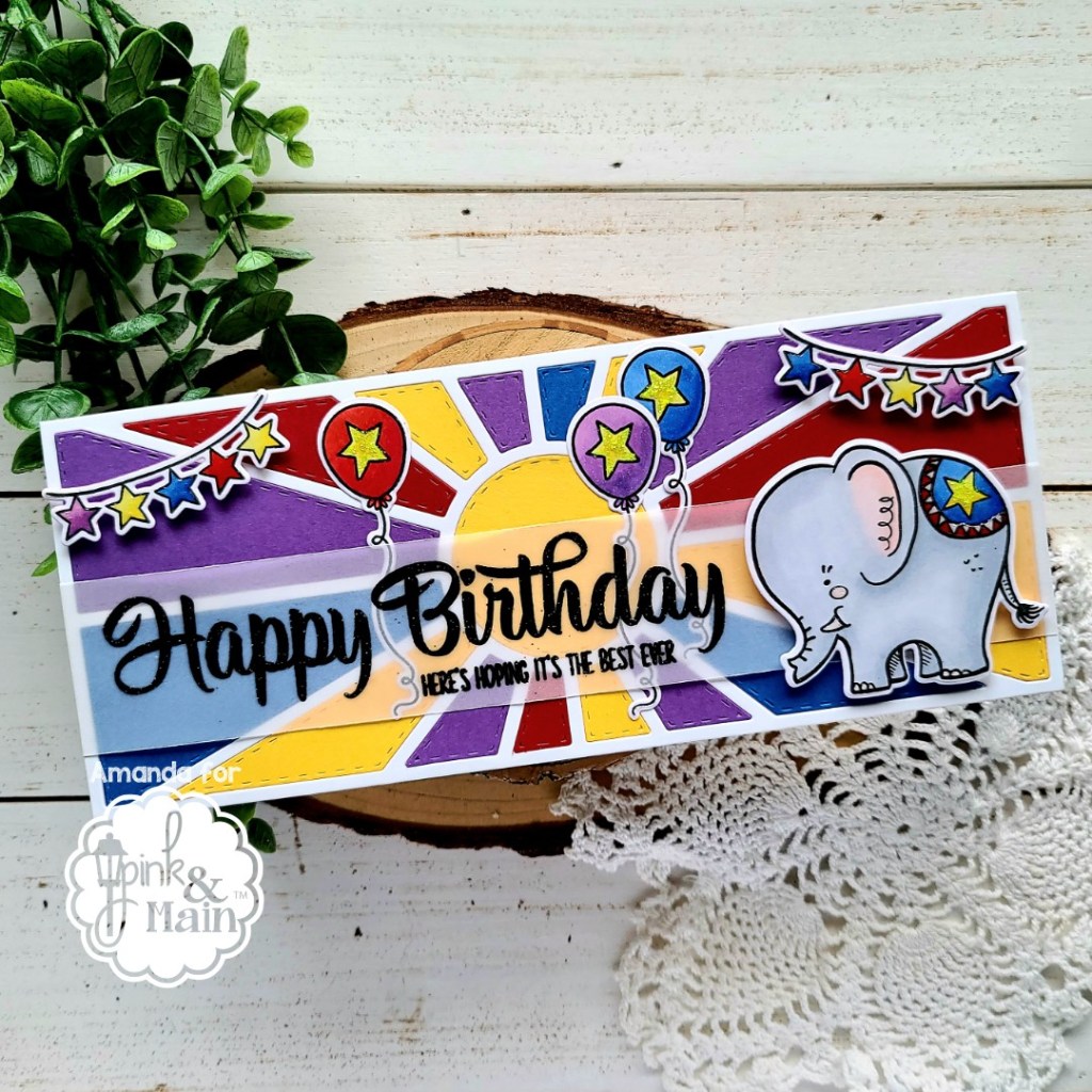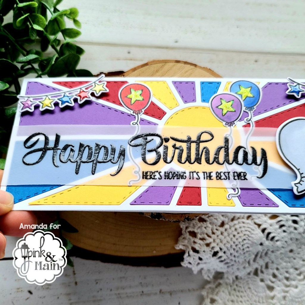Hey everyone!!! It’s release day for Pink & Main today and I’ve got a really fun card featuring 3 new products available in the shop right now! We’re playing with the new My Vote stamps and dies, Slimline Sayings 1 stamps and the awesome Sunburst Slimline die.