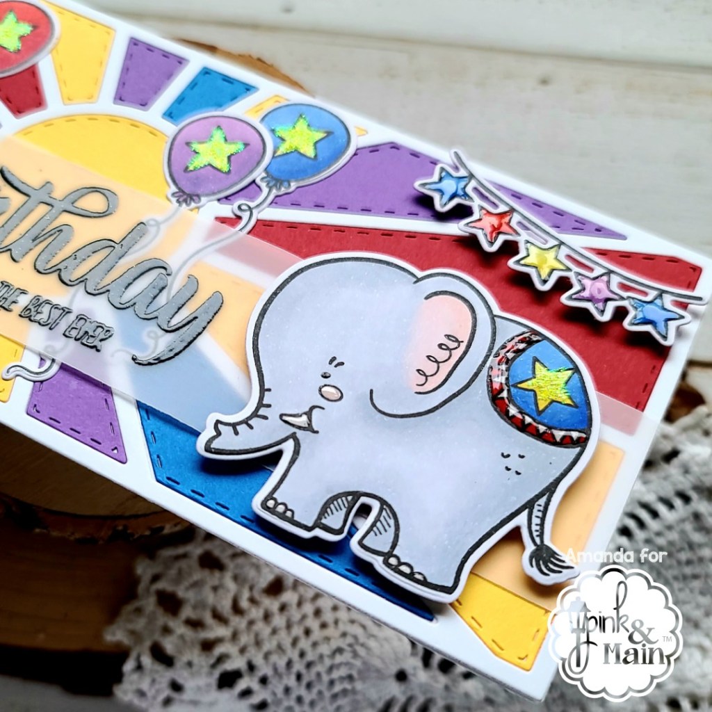 I stamped and heat embossed my sentiment from Slimline Sayings 1 on vellum with black embossing powder and got everything ready for assembly. I added foam squares to the back of the elephant and star banners. Using my images as guides, I used liquid glue to adhere the balloons down, then added the star banners and finally stuck my elephant to the sentiment banner. Last, I added liquid glue to the back of the sentiment banner, hiding it behind the embossing and the elephant. I put acrylic blocks on this portion for a while and came back later for finishing touches.