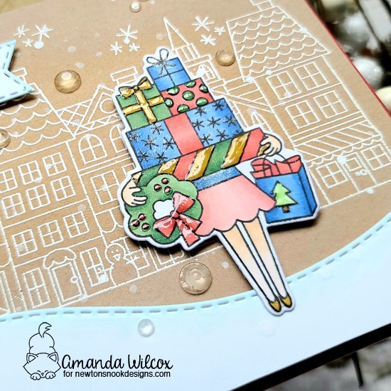 For those I added glossy accents to parts of the wreath and packages the lady is carrying and also Wink of Stella glitter brush pen to other packages and her belt and shoes. Last, I added some clear gems in various sizes throughout the whole design.