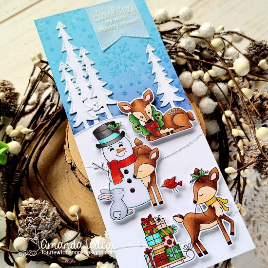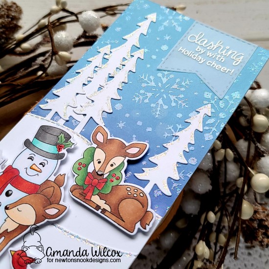 To make my card, I started by stamping and coloring the images from Festive Fawns with my copic markers. Then I used the coordinating dies to cut them all out. I arranged them on an oversized panel to see how far down I need my sky to go, then I blended chipped sapphire and tumbled glass distress oxide ink on a panel. I spritzed it with water and then dried it with my heat gun. I placed the Snowfall stencil over the top and inked it up with my VersaMark ink pad. I sprinkled some crystal glitter embossing powder over it and heated it up. The snowflakes have a little shimmer to them in the light. I just love it!