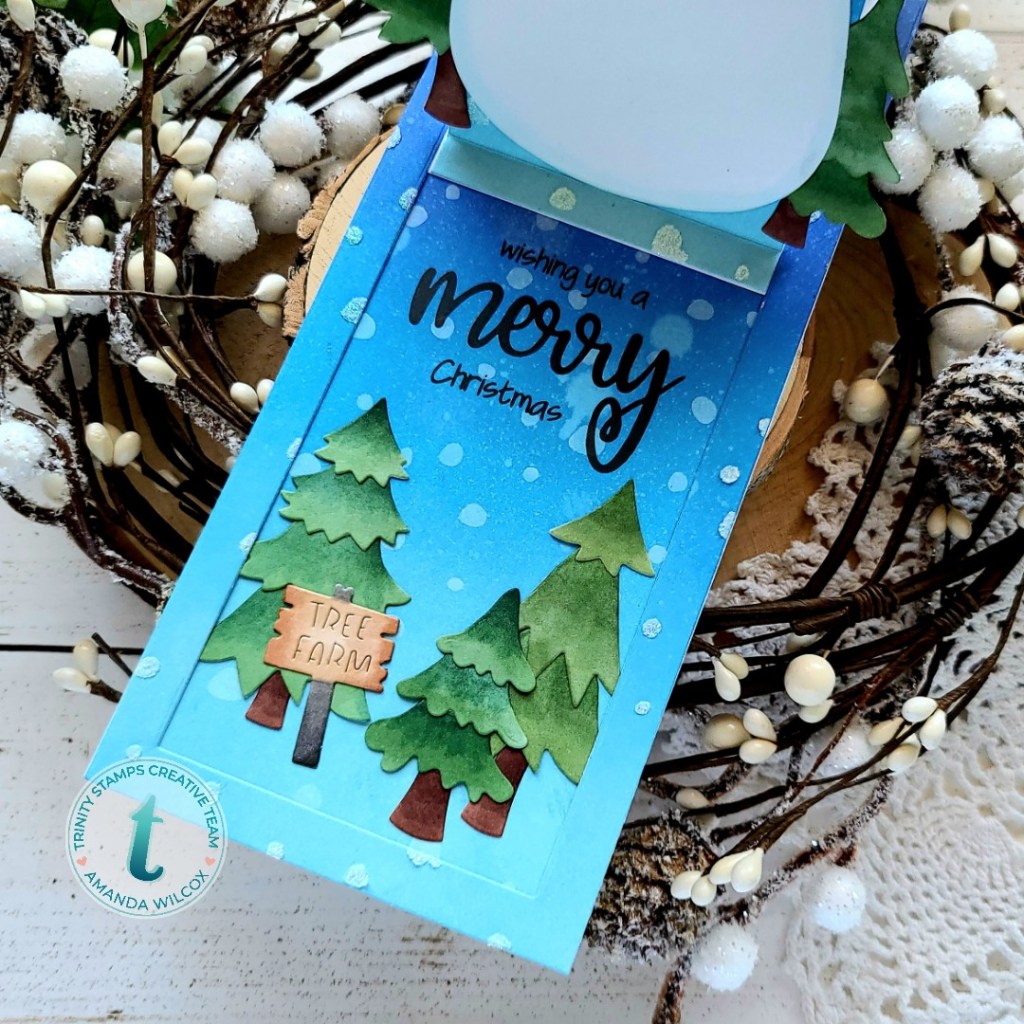 I had so much fun die cutting all of the pieces from Happy Snowman and Happy Little Tree Farm out of white cardstock and coloring them with my copic markers! Then I used distress oxide inks to create a beautiful blue winter scene and used glitter glitz gel over the slimline snowfall stencil. I did the same panel twice but the second time I just used Hero Arts Unicorn white ink on the stencil so it didn’t have any dimension to get in the way of the mechanism moving up and down.