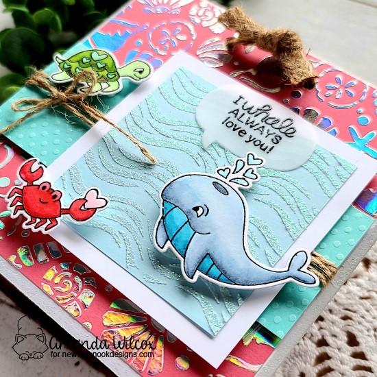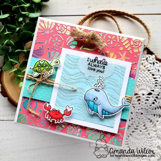 Next, I made a mess which is always so fun to me. I used the seashell stencil with Thermoweb transfer gel blanco on some coral colored cardstock and white glitter glitz gel on light blue cardstock with the waves stencil. I cleaned up after myself and left them over night to dry. In the morning I ran the seashells through my laminator with iridescent decofoil and totally swooned! These are gorgeous in the light!