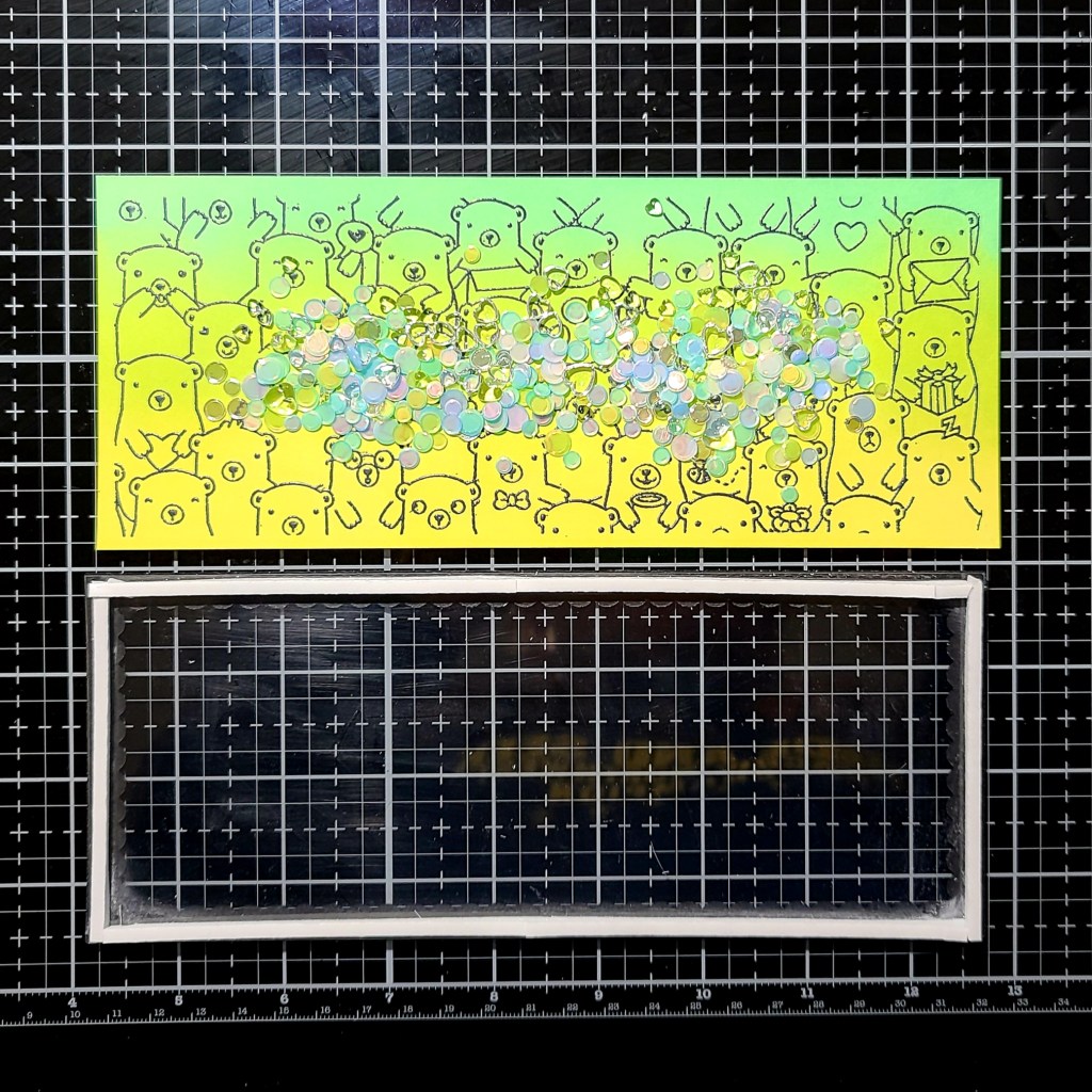 Switching gears back to the green-toned card, we’ve got our panel and now it’s time to build it into a shaker. I die cut the scalloped frame that comes with the Slimline Envelope Builder die set from back cardstock. I cut a piece of acetate and adhered them together with double-sided tape. Then I lined the frame with double-height foam strips.