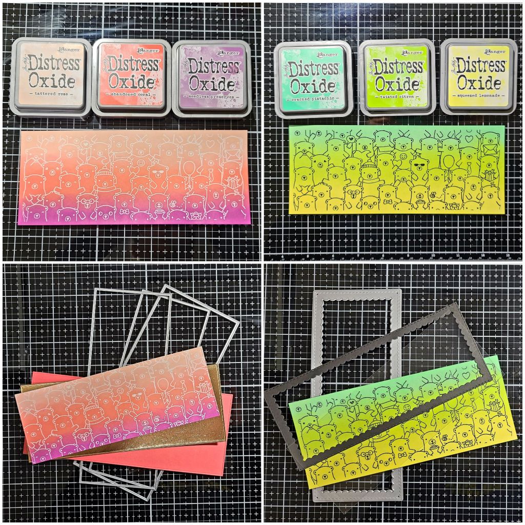 I started by inking up my Beary Special stamp with VersaMark ink and heat embossing 2 panels – one in white and one in black. Then I ink blended distress oxides over each one. I cut the green-toned one with the largest of the Modern Embossed Slimline dies. For the pink-toned panel, I cut three pieces with those same dies – coral cardstock, rose gold foiled cardstock, and then the inked panel.