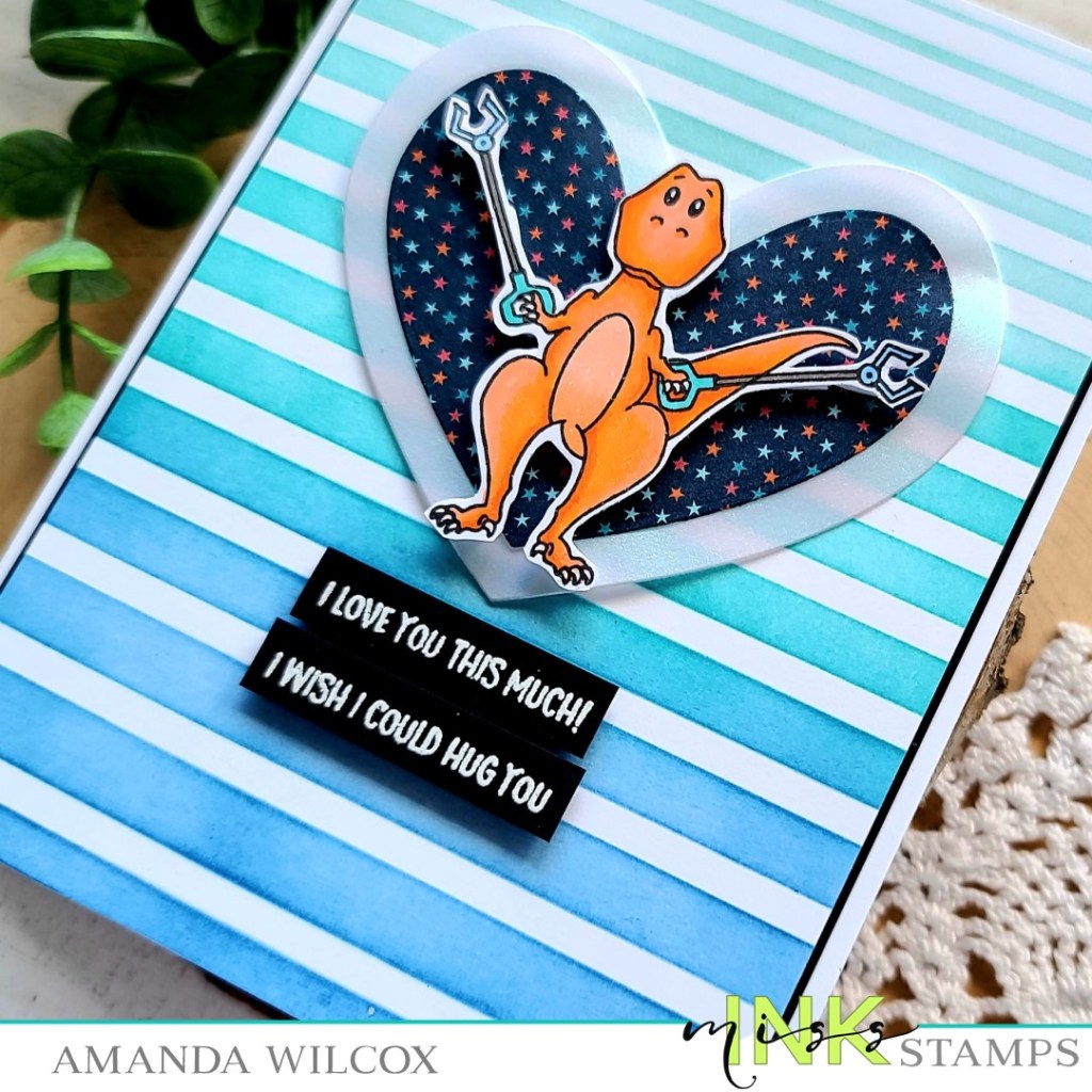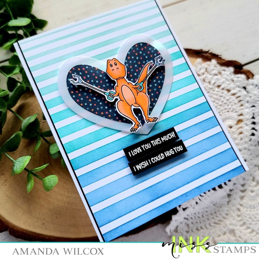 I started by stamping my dinosaur and then cut a mask for him. Then I stamped down the claw arms and removed the mask. I colored him with my copics and fussy cut him out. Then I moved on to my card front by inking up the Stripes stencil with blue and teal inks. on a white panel. I trimmed it down to 5.5×4. Then I glued a couple of thin black strips behind the edge for a little interest. I die cut 2 hearts from Trinity Stamps nested hearts dies and adhered them together. They are popped up with foam tape on the stenciled background and my dino is also popped up.