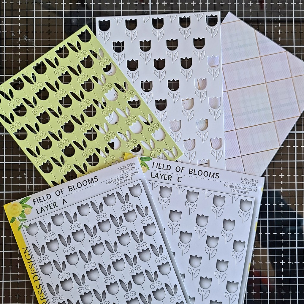 For my backgrounds, I used layer A and C of the Field of Blooms set. Then for my third card I pulled out the Memory Box spring plaid paper pad and chose one of the beautifully foiled pieces to use.