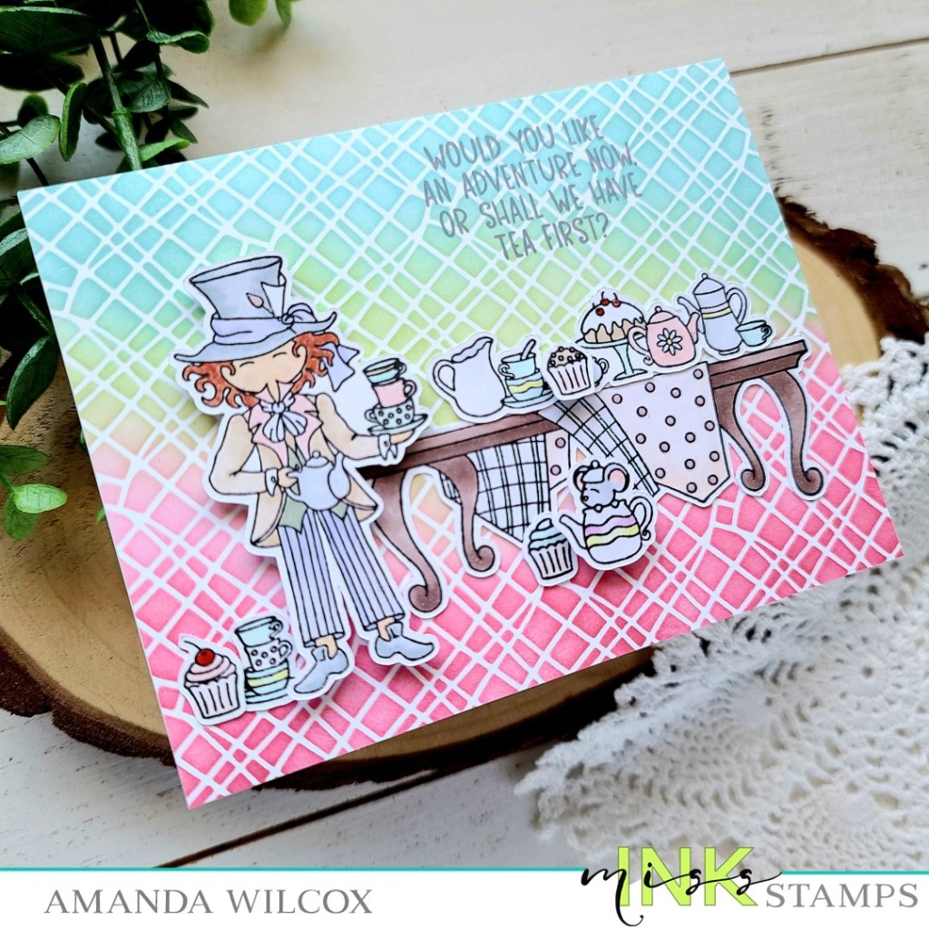 Hello everyone! I’m back again with a wonderful card featuring more Alice in Wonderland stamps from Miss Ink and one of the newly release stencils – square dance. Let’s jump right in!