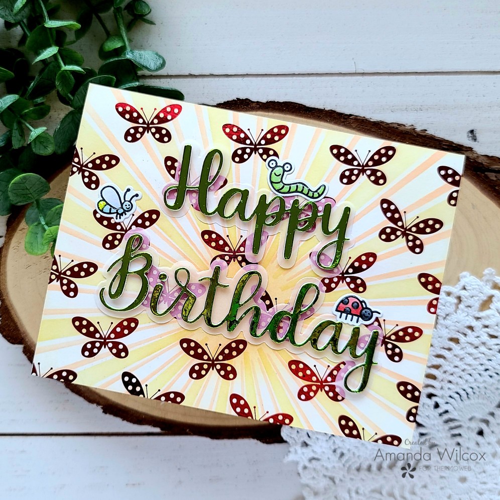 For this card, I inked up the Trinity Stamps Catching Some Rays stencil in the background and added their Scripty Birthday dies for a sentiment and topped things off with adorable bugs from the Bunny Burrow set.