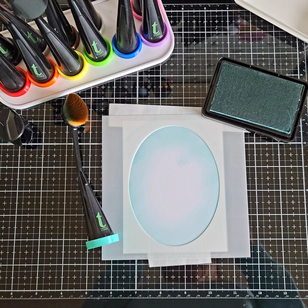 I started my card by cutting a white panel to A2 size and pulled out my oval foundations stencil and a blending brush. I taped on the largest oval and inked up the edges with a light teal ink.
